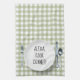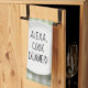 Alexa elektronische Apparatur Befehl zum Kochen des Abendessens auf einem weißen Teller und sage grün-weiß Gingham Muster. Text auf Platte kann geändert werden.