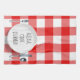 Alexa elektronische Apparatur Befehl zum Kochen des Abendessens auf weißer Tafel und Silbergeschirr. Hintergrund ist rot-weiß Büffel kariert