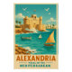 Retro Reiseplakat von Alexandria, Ägypten. Zentrum: Die Mittelmeerküste mit den Wellen, die gegen das Ufer abstürzen, mit der modernen Zitadelle von Qaitbay, die auf dem Gelände des alten Leuchtturms von Alexandria errichtet wurde. Foreground: kleine Fischerboote und traditionelle Felucca-Segel schwimmen im türkisfarbenen Wasser.