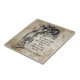 Alice im Wunderland; Cheshire-Katze mit Keramik Alices weißer Fliese/Trivet. Feenhafte Geschichten der Vintagen Illustration und Kinderzimmerreimbild von Alice mit der Cheshire-Katze durch John Tenniel in Lewis Carroll Alices Abenteuern in Märchenland, 1865, ein Text-entworfener Dialog eingeschlossen. "Wir sind alle hier":) gesetzt auf einen alten Blumenpergamentpapierhintergrund wütend.