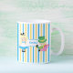 Niedliche Alice im Wunderland individuelle Tasse für ein buchstäbliches Geburtstagstee-Party. Die kleine Elke in ihrem blauen Kleid und der Mad Hatter sitzen auf hübschen, blau-gelben Streifen. Passen Sie dieses skurrile Party mit Ihrem eigenen Text an.