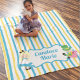 Niedliche Alice im Wunderland Decke für ein Kind, das Lieben hat, Kinderbücher zu lesen. Kleine Elke in ihrem blauen Kleid und die Mad Hatter in einem Teacup an einer hübschen blauen Grenze auf einer kuscheligen Babyblau und gelb gestreiften Decke für ein Mädchenzimmer.