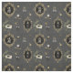 Zu den Mustern zählen Alice, Königin des Herzens, Tweedledum - Tweedledee, Kartensoldaten, Humpty Dumpty, Cheshire Cat, Teekanne, Krone, Tränke, Uhr und Rose auf schwarzem Denim-Hintergrund.