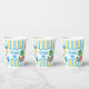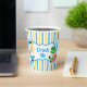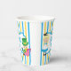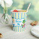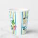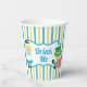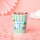 Niedliche Alice im Wunderland Happy Birthday Papier Tasse für eine buchstäbliche Geburtstagsparty. Kleine Frau Alice in ihrem blauen Kleid und die Mad Hatter in einem Teacup auf einer hübschen blauen Grenze auf einer skurrilen, blau und gelb gestreiften Karte. Trinken Sie mich in einem Kindertee-Party oder in einem Bücherwurm.
