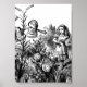 Die Blume halten Alice auf, sich zu unterhalten, während sie einen Gartenweg in Wonderland entlang geht. Vintage Darstellung im öffentlichen Bereich.