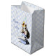 Mittlere und weiße, schachige, glänzende Geschenktasche mit einem Vintagen Alice im Wunderland-Bild, vorne von Alice, das die Krone der Königin der Herzen trägt. Siehe passende Konfetti, Gefälligkeitstasche, Gefälligkeitsverpackung, viereckige Gunst-Tag, Etikett und Packpapier. Sehen Sie sich die gesamte Wonderland-Geschenktüte-Sammlung in den SPEZIELLEN TOUCHS an. | Abschnitt Gastgeschenke.