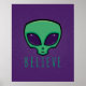 Cartoon Alien Kopfbild mit großen dunklen Augen mit "Glaube" Schrift.