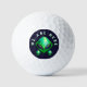 Cool fun golf ball with a printed image of 3/three green alien heads on a very dark blue background,