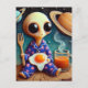 Eine lustige Alien in PJs mit einem Kaffee und Ei zum Frühstück schmeichelt durch eine künstlerische Arbeit