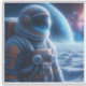 Ein Astronaut, der in einem schweren, frostigen Raumanzug verkleidet ist, steht auf einer trostlosen, eisigen Oberfläche und blickt auf weit entfernte Himmelskörper und eine lebendige kosmische Kulisse. Die Szene erfasst die Einsamkeit und das Wunder der Weltraumforschung während der frühen Morgenstunden.