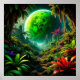 Eine surreale Szene mit einem üppigen Dschungel aus Alien unter einem atemberaubenden grünen Planeten. Die lebhaften Farben und exotischen Pflanze stellen eine fantastische, traumhafte Kulisse dar, die Abenteuer, Erkundungen und die Geheimnisse weltlicher Umgebungen hervorruft.