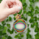 Dieser Schlüsselanhänger zeichnet sich durch ein buntes Muster von hellen psychedelischen Farben aus, das eine zentrale Eizellstruktur umgibt. Es ähnelt einer Fantasie eines Raumschiffs der Alien, das bereit ist, ein Erdling abzuwehren.
