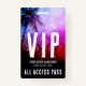 Dieses VIP-Abzeichen zeichnet sich durch ein farbenfrohes und dynamisches Design aus, das sich ideal für ein Outdoor-Konzert oder ein Party mit Coachella-Ambiente eignet. Oben zeigt eine lebendige Mischung aus blauen, rosa, roten und lila Kunstwerken Silhouetten von Konzertbesuchern und eine Palme in den oberen links, um das lebendige Festivalgefühl zu erfassen. Das Bild wird unten glatt in Schwarz angezeigt, wobei der Ereignisname, das Datum und der "Gesamte Zugriffspass" in weißen Schriftart mit "VIP"-Fettdruck am oberen Rand angezeigt werden. Das gleiche Design erscheint auf beiden Seiten für einen polierten und zusammenhängenden Look. Alle Schriftart- und Textfarben sind vollständig anpassbar, und Sie können das Bild oder die Farbpalette an Ihr Veranstaltungsthema anpassen.