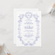 Elegant classic traditional floral French Victorian dusty blue toile de jouy chinoiserie style crest monogrammed charming budget affordable all in one wedding invitation with all the details, QR code to RSVP on website.