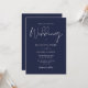 Diese elegante Skriptnavy Blue Hochzeitseinladung kann mit Ihren Informationen in chic Typografie mit Ihren Hochzeitswebsite-Details und Ihrem QR-Code auf der Rückseite personalisiert werden. Entwickelt von Thisisnotme©