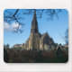 A high-resolution view of the Grade II listed All Saints Church in Salterhebble, West Yorkshire. The image captures the church’s impressive Gothic Revival spire and detailed stonework from the perspective of the historic graveyard. Framed by silhouetted tree branches against a crisp blue sky, the late afternoon sun illuminates the weathered textures of the sandstone, highlighting the architectural heritage of the Calderdale region.