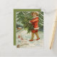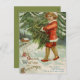 Diese Vintage Viktorianische Weihnachtskarte ist mit einem hübschen Jungen in einem roten Anzug mit weißem Pelz und Goldspat gekleidet und trägt einen grünen Weihnachtsbaum auf einer schneebedeckten Spur. Der Text lautet: "Alle guten Wünsche zu Weihnachten" und "Möge die Freude neben dir schweben und alles Leben ist frei."