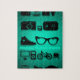 Schwarze cliparts über Zuhause und verschiedene Sachen: Wecker, Fahrrad, Radio, Kamera, Lehnsessel, Fernsehen, Gläser, etc. auf einem schönen leuchtenden Hintergrund des blauen Grüns.
