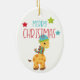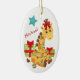 Auf der Vorderseite dieses Sake-Ornaments für ein Kind ist eine bezaubernde Giraffe, die in eine Reihe von Weihnachtslichtern verpackt ist. Neben ihm sind hell verpackte Urlaubspakete. Der Name deines Kindes ist in Rot knapp unter einem blauen Stern. Auf dem Rücken befindet sich ein anderes Bild der Giraffe, zusammen mit einer fröhlichen Weihnachtsbotschaft und weiteren Sternen. Niedlich!