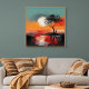 Dieses atmosphärische Kunstwerk fängt einen stillen Moment der Einsamkeit unter einem leuchtenden Sonnenuntergang ein. Eine einsame Figur steht am Wasser neben einem windgepeitschten Baum, silhouettiert gegen einen weiten Himmel, der in warmen Tönen von verbranntem Orange, Korallenrot und sanftem Gold gemalt ist. Die übergroße Sonne hängt tief am Horizont, ihr Licht spiegelt sich auf der stillen Oberfläche des Sees und schafft einen traumhaften Spiegel aus Farbe und Emotion.