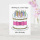 Ein großer Kuchen mit einem rosa Bogen um ihn herum und beleuchtete Kerzen oben, begleitet von den Worten "Einen sehr glücklichen 101. Geburtstag wünschen".