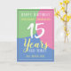 Feiern Sie einen Geburtstag mit einer personalisierten Karte, die den Namen, die Anzahl der Jahre und das Datum des Empfängers anzeigt. Fügen Sie auch eine Nachricht hinzu. Geburtstagskarte für 15 Jahre.