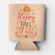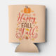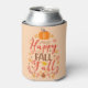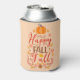 Farbige Illustration mit "Happy fall y'all" Textdesign und Blume, Kürbis und Blätter für alle, die gerne fallen