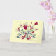 Blumen in Magentarotem und Blau, korallenroter Hintergrund und alles Gute zum Geburtstag, 生日快樂 in Canonese und englisches, nach innen und auf Front.