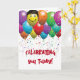 Farbenfrohe Ballonsteine mit dem menschlichen Haar, den Augapellen, einem Lächeln und Sternkonfetti auf Weiß für einen humorvollen Geburtstag. Alle Texte können bearbeitet werden.