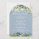 Diese elegante Eukalyptusgrüne botanische Saitenleuchten dustige blaue Hochzeitseinladung kann mit Ihren Informationen in schicker Typografie personalisiert werden, mit all Ihren speziellen Informationen zum Hochzeitstag auf der Rückseite, inklusive Ihrer UAWG, Unterkunft und weiteren Details. Entwickelt von Thisisnotme©