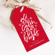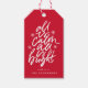 Elegante, moderne Geschenktipps mit dem Satz "Alles ist ruhig, alles ist hell" in einem weißen, handgeschriebenen Drehbuch mit Sternexplosion Akzenten vor einem hellroten Hintergrund. Personalisieren Sie die Vorderseite des Geschenketiketts, indem Sie Ihren Namen oder benutzerdefinierten Text hinzufügen. Der individuelle Geschenktag kehrt zu einem Muster von Schneeflocken in Rot und Weiß der Sternexplosion zurück.