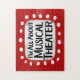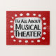 "I'm All About Musical Theatre" ist ein niedliches Textdesign in rot mit schwarzem Text, zusammen mit einer weißen Akzent-Form und weißen texturierten weißen, weißgetönten weißen Punkten, die ihn umgeben.
