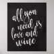 Ein elegantes Hochzeitszeichen, das den Text "Alles, was Sie brauchen, ist Liebe und Wein" in einem extrovertierten Script-Schriftart enthält, die Pinseltextur fügt ein spontanes und spielerisches Gefühl hinzu. Die Hintergrundfarbe kann nach Ihren Wünschen und Vorlieben personalisiert werden, bitte kontaktieren Sie mich, wenn Sie eine spezielle Anfrage haben.