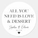 Ein klassischer Schwarz-Danke-Hochzeitsaufkleber mit dem Titel "Alles was Sie brauchen ist Liebe und Dessert" in einem klassisch-modernen, eleganten Schriftart. Sie können es einfach mit Ihren Namen und Hochzeitsdatum personalisiert.