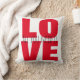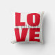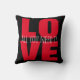 Dieses Kissen ist mit einem grafischen Design mit Text ausgestattet. Das Wort LIEBE ist in großen, fett roten Buchstaben. In der Mitte ist "Alles, was du brauchst, ist Liebe" schwarz. Auf der Rückseite des Kissens ist das Design schwarz und "Alles, was du brauchst, ist Liebe" weiß. Sie können die Farben anpassen.