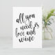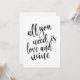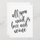 Ein elegantes Hochzeitszeichen, das den Text "Alles, was Sie brauchen, ist Liebe und Wein" in einem extrovertierten Script-Schriftart enthält, die Pinseltextur fügt ein spontanes und spielerisches Gefühl hinzu. Die Hintergrundfarbe kann nach Ihren Wünschen und Vorlieben personalisiert werden, bitte kontaktieren Sie mich, wenn Sie eine spezielle Anfrage haben.