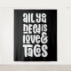 Dieses Design enthält den Satz "Alles was Sie brauchen ist Liebe & Tacos" in einem kühlen, spielerischen Schriftart. Der Text hat einen lustigen und lässigen Stil, der eine Touch von Spaß und Positivität hinzufügt, sodass er perfekt für Taco Liebhaber und diejenigen, die eine leichte Botschaft zu schätzen wissen.