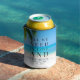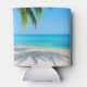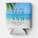 Große Hochzeitskur oder Gunst für Ihre Hochzeitsgäste. Biercozies mit einem wunderschönen Strandhintergrund, bedruckt mit der Meldung "Alles was wir brauchen ist Liebe und Strand" und Ihren Namen und Hochzeitsdatum. Unten kann eine Danksagung angezeigt werden.