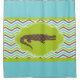 Duschvorhang mit Zickzack gestreiftem Hintergrund in Grün, Weiß, Blau und Braun mit türkisblauen breiten Rändern oben und unten und einem braunen Polka gepunkteten Alligator auf einem grünen Banner in der Mitte.