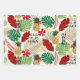 Feiern Sie den Urlaub mit diesem modernen Aloha Print! Festisch dekorierte Ananas, tropische Blätter und Blume aus Hibiskus werden mit dem hawaiianischen Gruß Mele Kalikimaka und ALO-HO-HO-HA geworfen. Der Allover-Druck hat einen tonalen Ticketstreifen im Hintergrund. Das dritte Blatt ist nur der tickende Streifen.