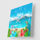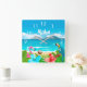 In den Tropen: Hawaiian beach with blue and red Hibiscus flowers, palm leaves, fläingo and blue and yellow parrot. Coconut on the sandy beach, blue ocean with waves and the blue sky. White Text: Aloha. A clock for your summer home or beach house.