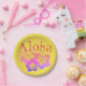 "Aloha" in lustiger Retro-Stil Schriftart auf gelbem Hintergrund mit lila ombre Hibiskus tropische Blume Trio. Ideal für ein Party im Garten, ein Kinderbecken, Geburtstage und mehr