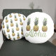 Aloha! Alle Ananas sind auf diesem runden tropischen Kissen gewartet. Doppelseitig können Sie den Text ändern und eine Hintergrundfarbe hinzufügen