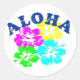 Aloha in der hawaiianischen Sprache bedeutet Zuneigung, Liebe, Frieden, Mitgefühl und Gnade. Seit der Mitte des 19. Jahrhunderts ist es auch als englischer Gruß benutzt worden, um sich zu verabschieden und zu grüßen. Momentan wird es hauptsächlich im Sinne von hallo verwendet. Dieser runde Aufkleber enthält eine farbenfrohe Gestaltung hawaiianischer Blume in Rosa, Gelb, Grün und Blau. Sehr tropische Grafik mit abgenutzter Wirkung.