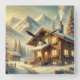 Alpine inspirierte Winterlandschaft mit gemütlichem Chalet umgeben von schneebedeckten Bäumen und majestätischen Bergen. Ideal für rustikale Dekoration, saisonale Kunst und Urlaubsstiftung!