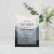 Eine Babydusche-Einladung Postkarte mit einem Foto von schönen Bergen, bewölktem Himmel und sanften Hügeln mit Bäumen im Vordergrund. Graublau.