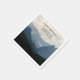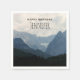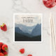 Papierservietten zum Geburtstag mit einem Foto von schönen Bergen, bewölktem Himmel und sanften Hügeln, die im Vordergrund mit Bäumen gefüllt sind. Graublau.