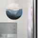 Ein Magnet mit einem Foto von schönen Bergen, bewölktem Himmel und sanften Hügeln voller Bäume im Vordergrund. Graublau.