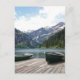 Schöner, ruhiger Alpensee mit Booten und üppig grünen Bergen im Hintergrund. Auf Party Produkte, Gefallen und Geschenke.