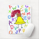 Niedliches wunderliches kindliches Zeichnen eines kleinen Mädchens umgeben durch Buchstaben des Alphabetes.